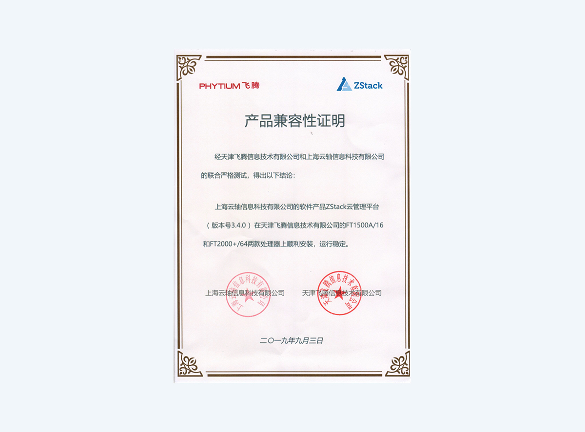 ZStack早在2019年就开始了FT1500以及FT2000+两款处理器的适配,并在同年9月份与天津飞腾信息技术有限公司完成产品兼容性互认证!作为自主创新的开源云引擎,ZStack开放兼容的特性,能够完全支持并兼容飞腾芯片。同时在飞腾芯片的支持下,ZStack也将继续提供安全可信的信创云平台。